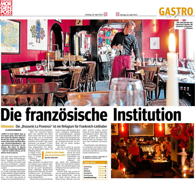 Was zeichnet das heimelige Lokal im Szenestadtteil Ottensen aus? Seit über fünf Jahren steht die Brasserie la Provence für köstliche, südfranzösische Küche, exzellente Weine und familiäres Flair. Wer Sehnsucht nach duftenden französischen Kräutern und Klassikern wie Steak/Frites/Salade, Coq au Vin oder Crème Brulée (mit feinstem Lavendel) hat, ist hier genau richtig. Das Ambiente ist stilecht: Stephan Hippe und Boris Krivec, die beiden Hausherren, haben ihr Kleinod liebevoll eingerichtet, gehalten in Ochsenblutrot und Schwarz. Historische Bauelemente aus Aix-en-Provence setzen Akzente.